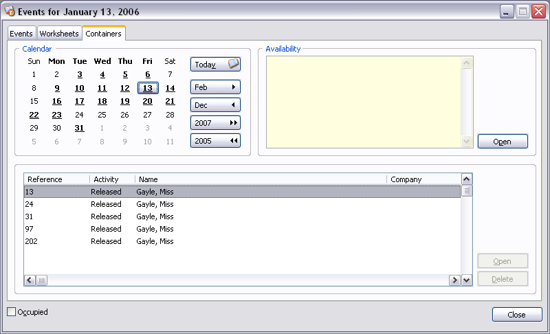 The events diary now consists of 3 tabs (with a 4th ‘scheduled’ for the Self Storage Module), Events, Worksheets and Containers.