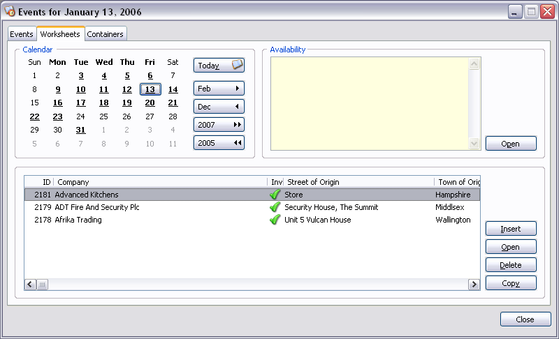 The Worksheets tab shows worksheets for the chosen date. Here you can Insert, Open and Delete worksheets, you can even Copy a worksheet, ideal for those multi day jobs.