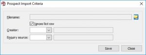 All three will give you pretty much the same options, asking for the filename of the CSV document, whether the first row is to be ignored (so, if you have setup your Excel worksheet with column headings to help you with the layout and you’ve left them in then you must check ‘ignore first row’), the creator and the enquiry source.