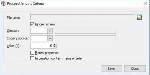 Importing the TwentyCI prospects gives you additional criteria such as value (if you provide a value then the house price must be in excess of this value in order to qualify as an importable prospect), whether the prospects are rentals (in which case you must be using the Rental layout specified above), and whether the prospects include the name of the seller (in which case you must be using the Seller layout specified above). Leaving the two checkboxes unchecked will mean the Basic layout specified above will be used.